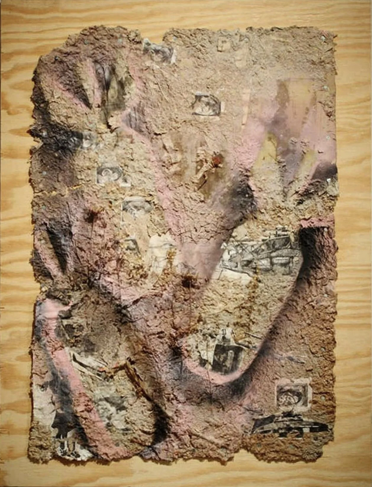 mixed media: handmade paper containing recycled paper, flour, cinnamon, nutmeg, and other spice mixed by hand in a kitchen blender; inlaid with sonogram photos, photocopies of disposable camera images, intaglio prints; stencils and spray paint; mounted on pine.